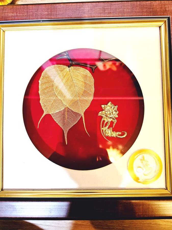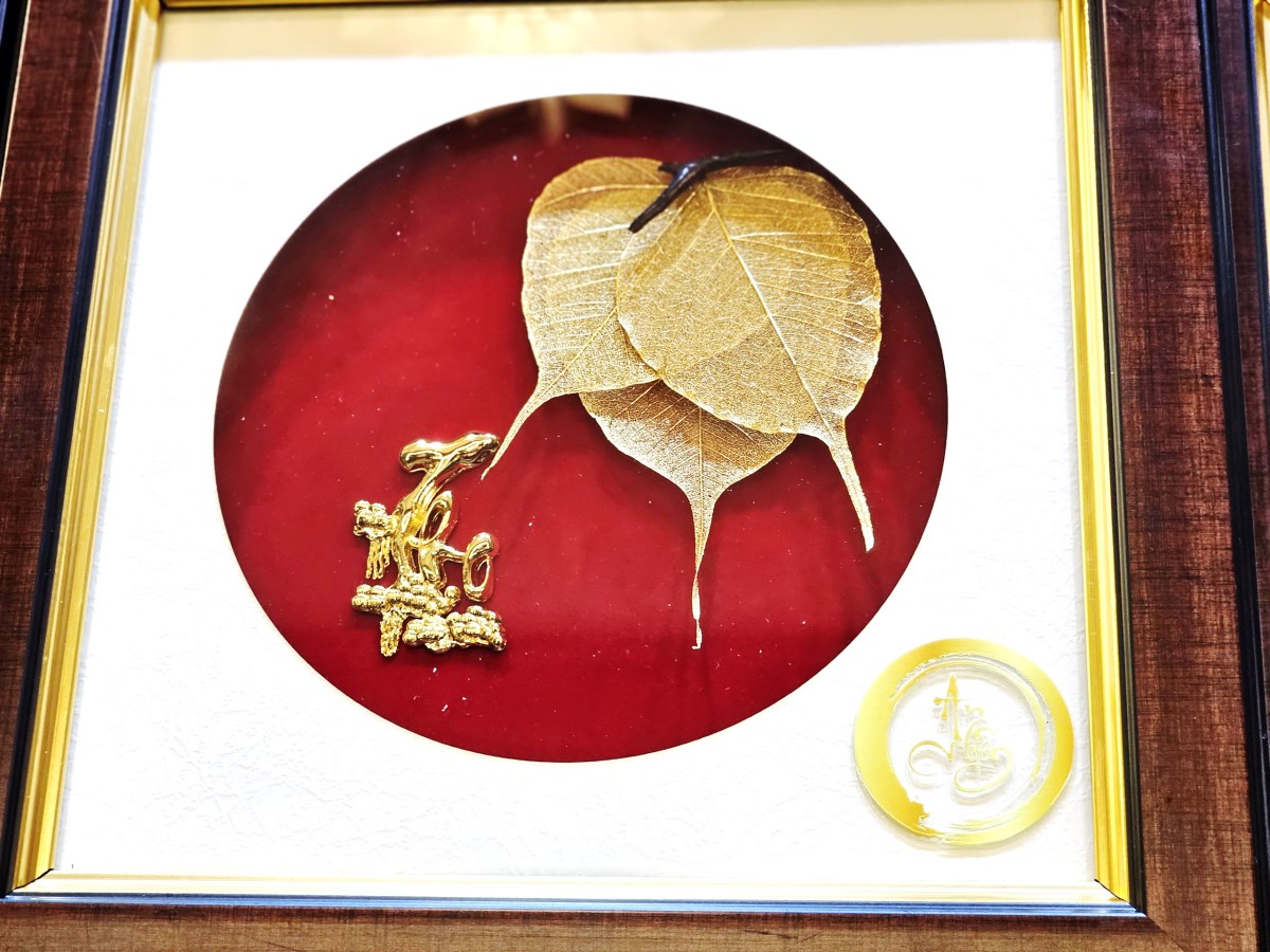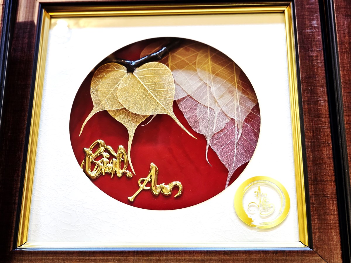 Tác phẩm nghệ thuật, quà tặng lưu niệm, tranh lá bồ đề mạ vàng gắn chữ