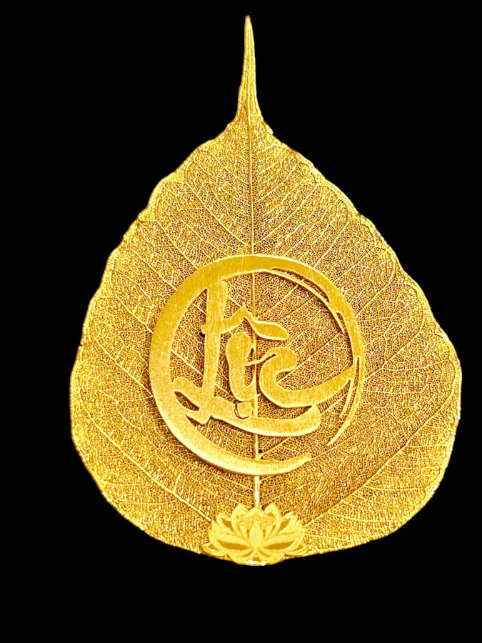 Lá Bồ đề mạ vàng chữ Tâm trên đế Sen