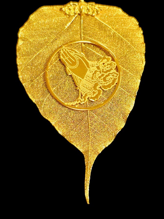 Lá bồ đề mạ vàng gắn biểu tượng phật đi khất thực