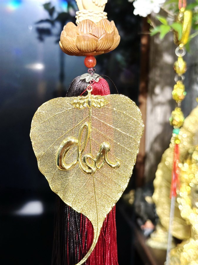 Lá bồ đề mạ vàng gắn biểu tượng phật đi khất thực
